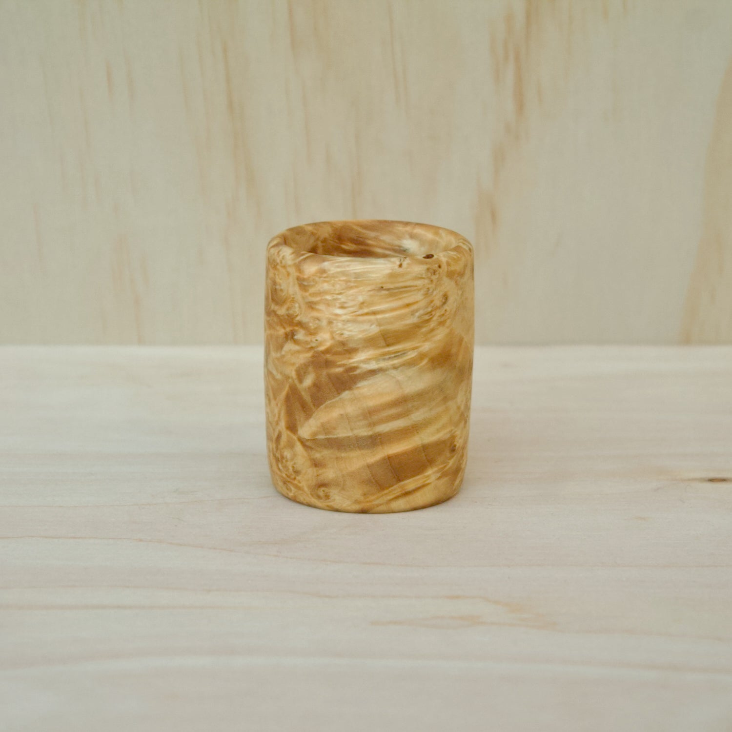 Handcrafted from a stabilized piece of Box Elder Burl, this shot glass highlights the wood’s dramatic character. Box Elder Burl is prized for its complex, interlocking grain patterns and rich tonal variations, often featuring flowing swirls, knots, and striking contrasts that give each vessel a unique identity. Stabilization enhances the burl’s natural beauty while ensuring it remains resistant to humidity changes, preventing expansion or contraction and increasing long-term durability.
