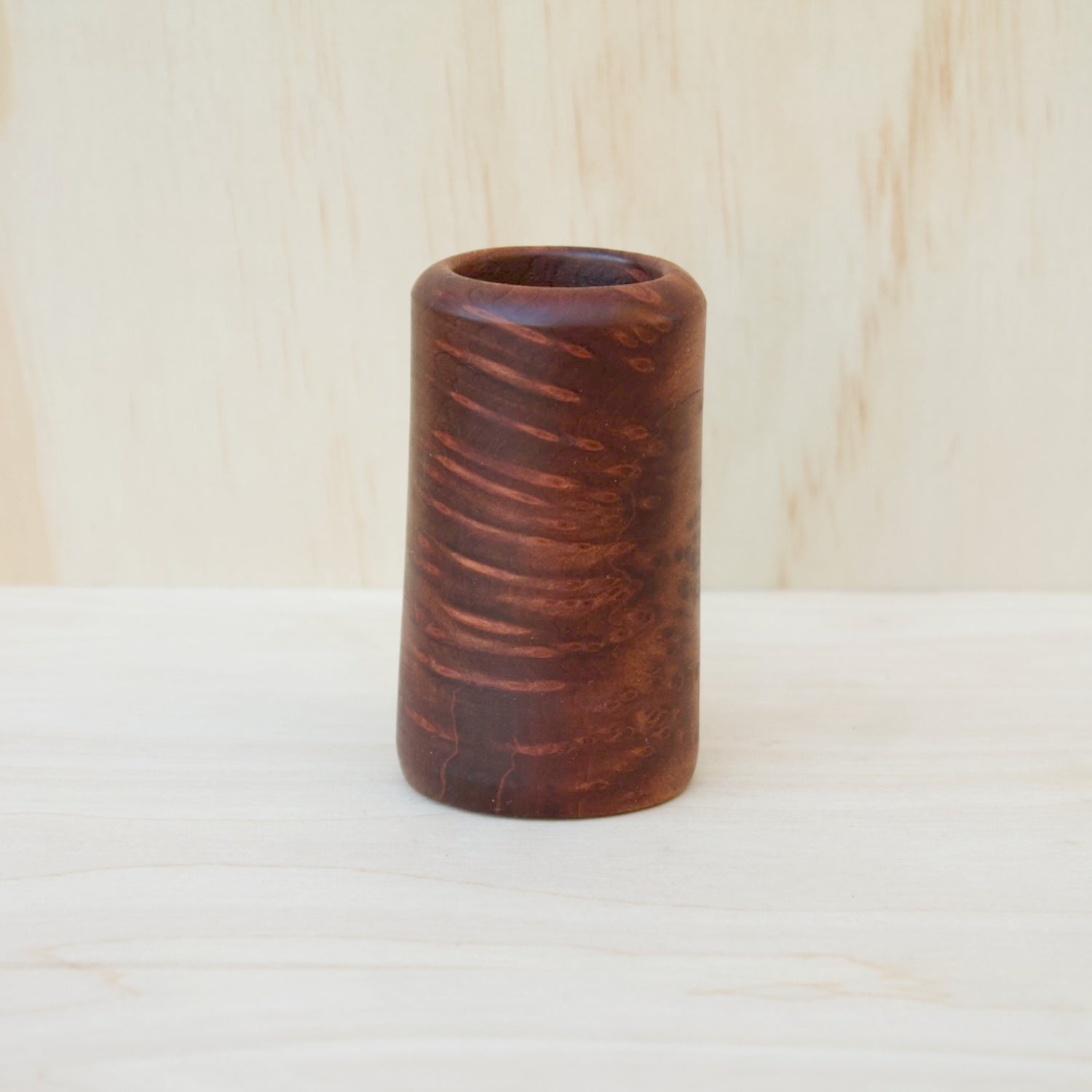 This shot glass is turned from redwood burl—a material prized for its deep, earthy tones and intricate grain. The surface reveals a tapestry of reddish-brown swirls, tight burl eyes, and subtle chatoyance that shifts with the light. The form is slightly tapered, giving it a comfortable grip and a quiet elegance.