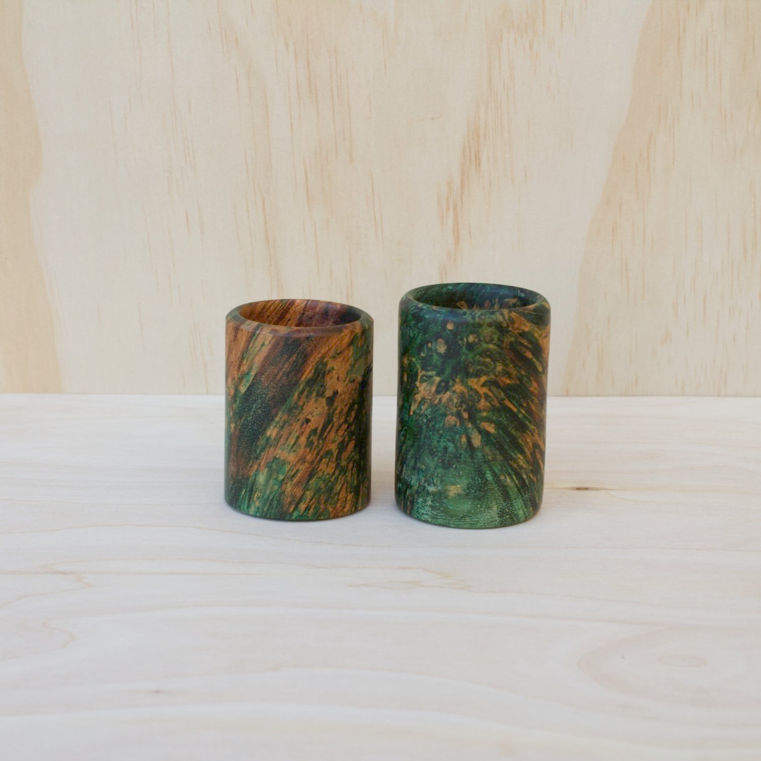 These shot glasses are crafted from River Tamarind Burl sourced from Indonesia and stabilized with green dye. As with many burls, the dye permeates the wood in unpredictable, organic patterns—sometimes pooling in tight clusters, other times streaking across the grain like moss over stone. Each piece is a study in contrast: rich brown burl knots meet deep emerald swirls, with hints of reddish undertones and black accents that shift with the light.