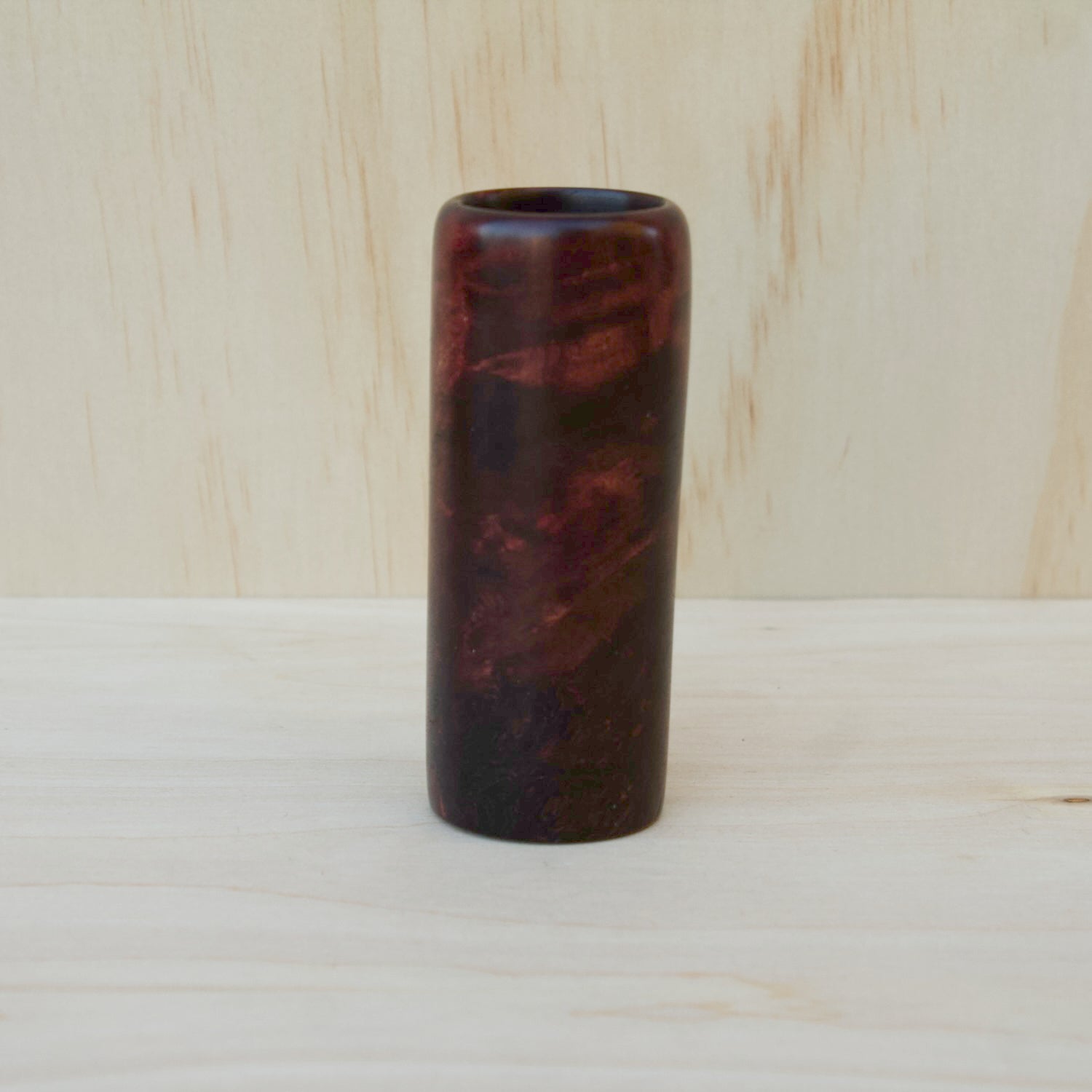 Turned from maple burl and stabilized to preserve its intricate grain, this shot glass is dyed in a deep ruby red—a color that doesn’t just sit on the surface but seems to burn from within. Stabilization allows the wood’s natural complexity to hold its shape and absorb the dye with precision, revealing swirling shadows, flame-like patterns, and pockets of dark grain that flicker like embers beneath polished glass.
