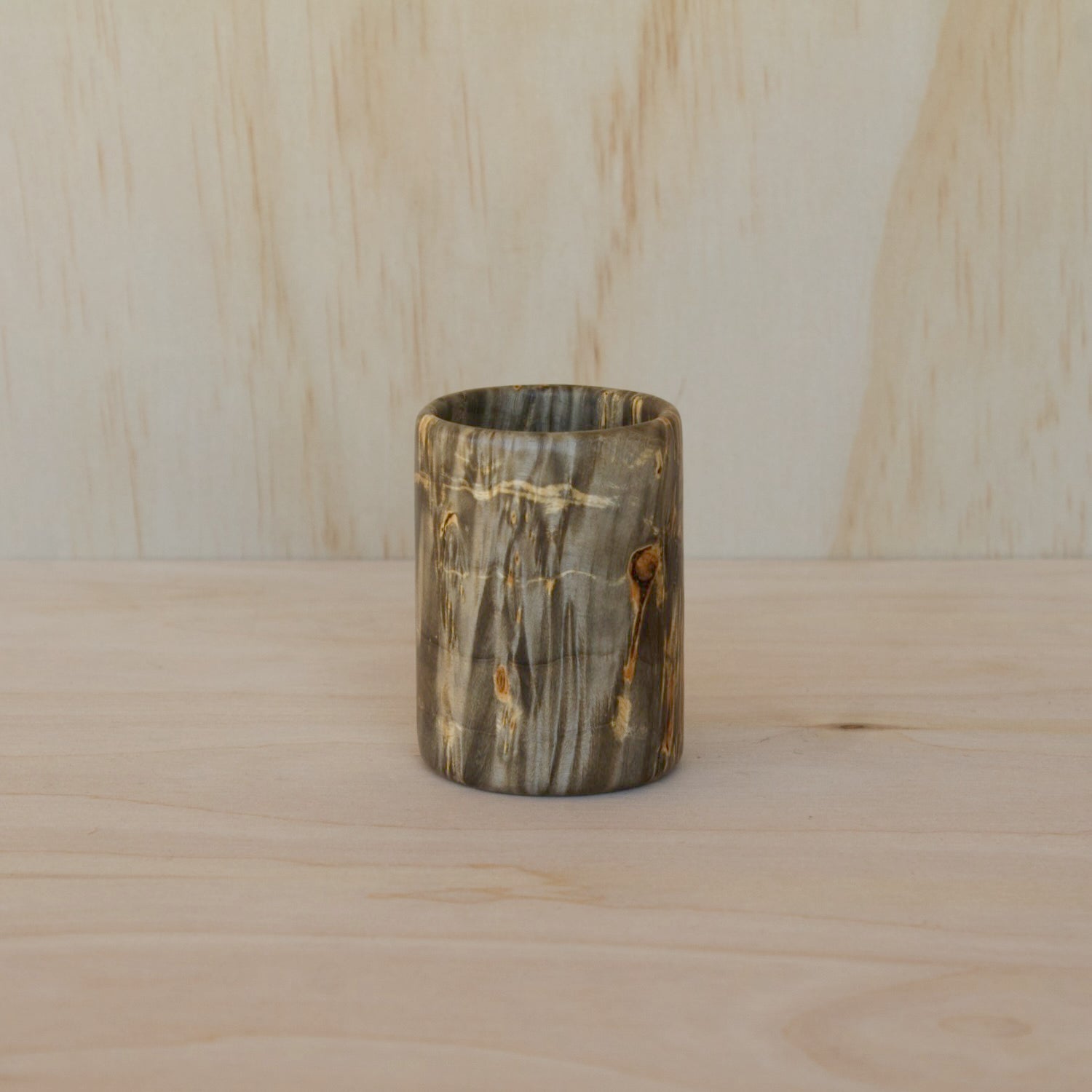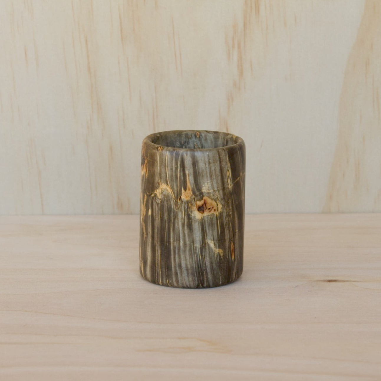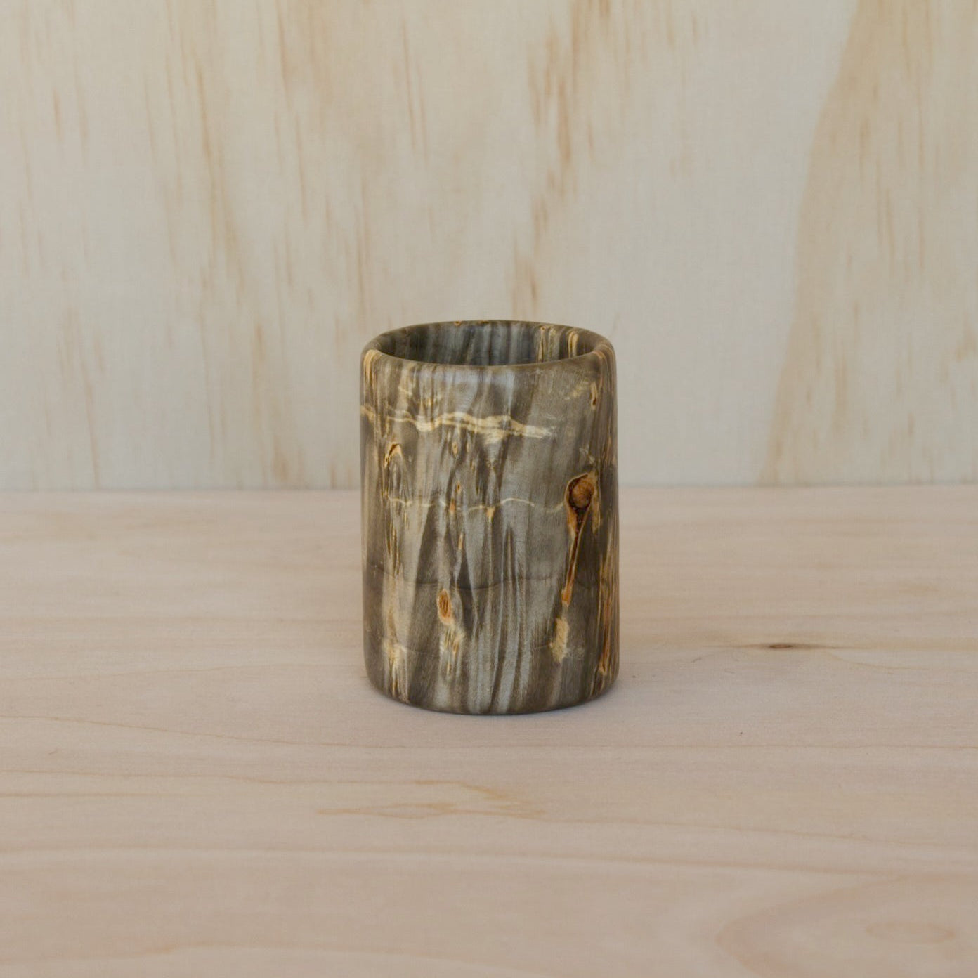 This shot glass was one of Dan’s earliest hand-shaped pieces—crafted before the lathe, before the catalog, before the business had a name. Formed with an angle grinder and refined through hours of sanding, it carries the marks of a maker learning through touch, patience, and trial. A similar piece lives in Dan’s personal collection, and another was among his very first sales—a quiet milestone that helped turn a passion into a path.