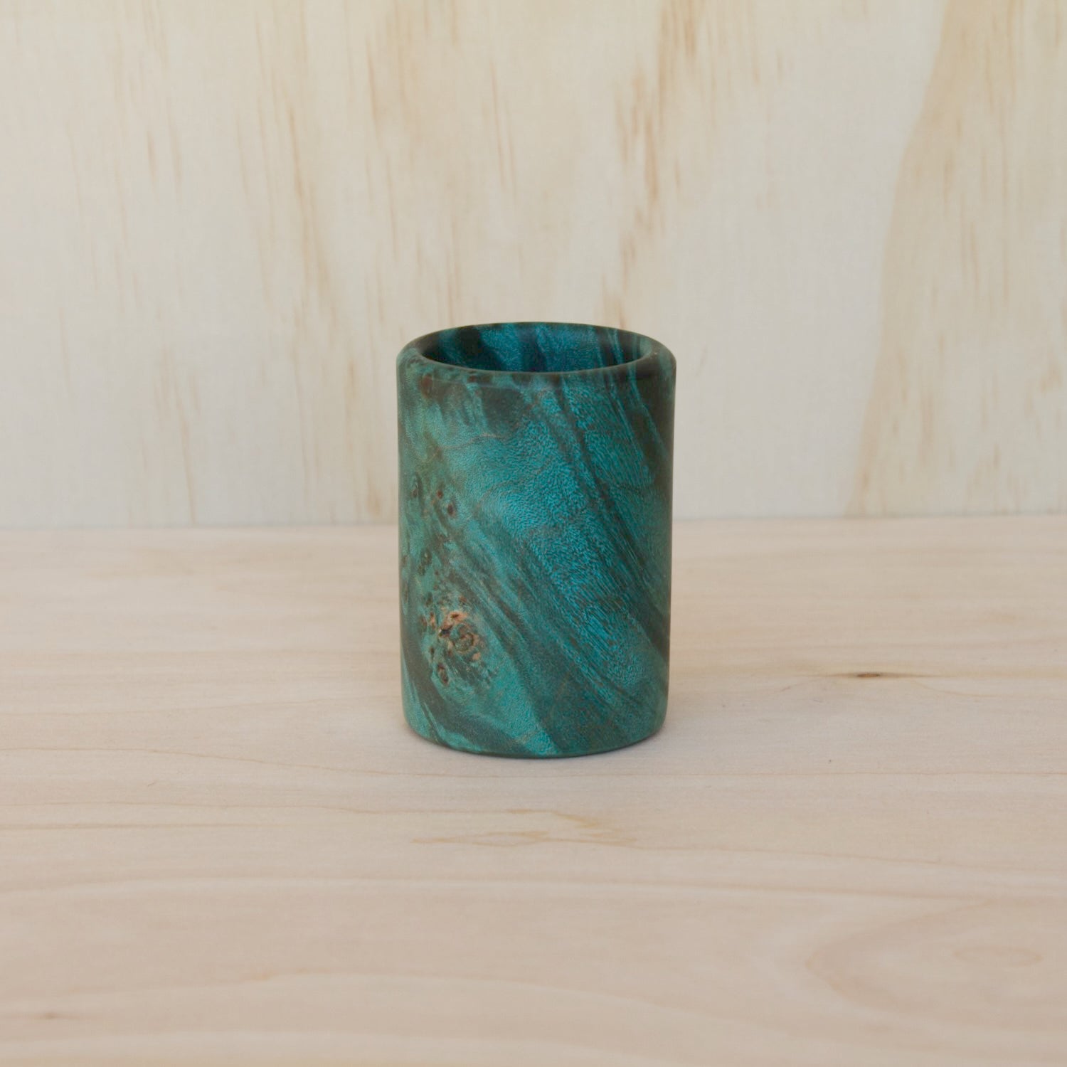 Hand‑turned from Mappa Burl (Populus nigra), this shot glass showcases the rare burl formations of the European Black Poplar, a cousin to the cottonwoods and aspens. Mappa Burl is prized for its chaotic, mesmerizing grain—swirling lines, clusters of “eyes,” and irregular textures that make each piece a natural work of art. Typically pale tan to creamy beige in its raw state, this specimen has been stabilized and dyed a deep blue, transforming its organic figure into something even more dramatic.