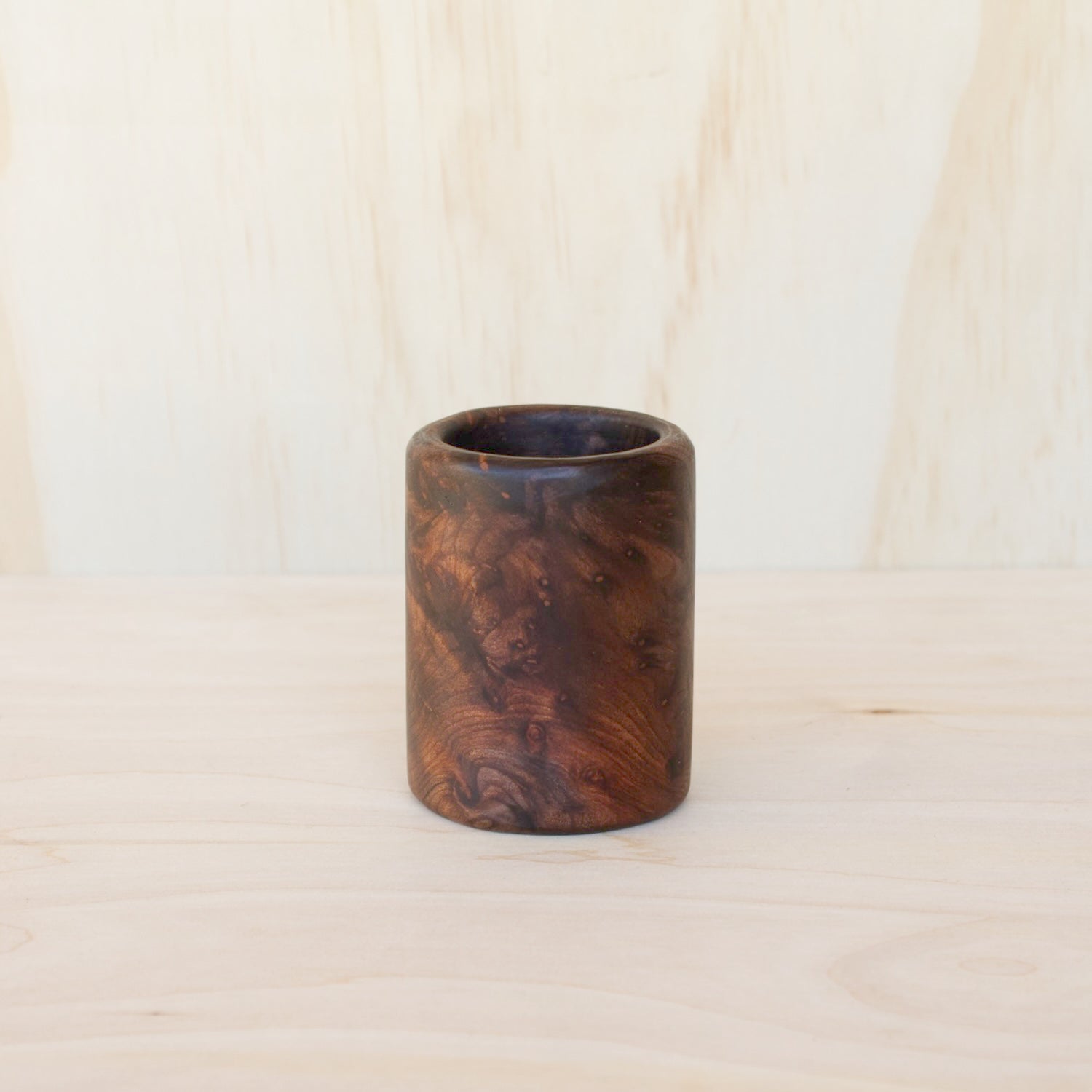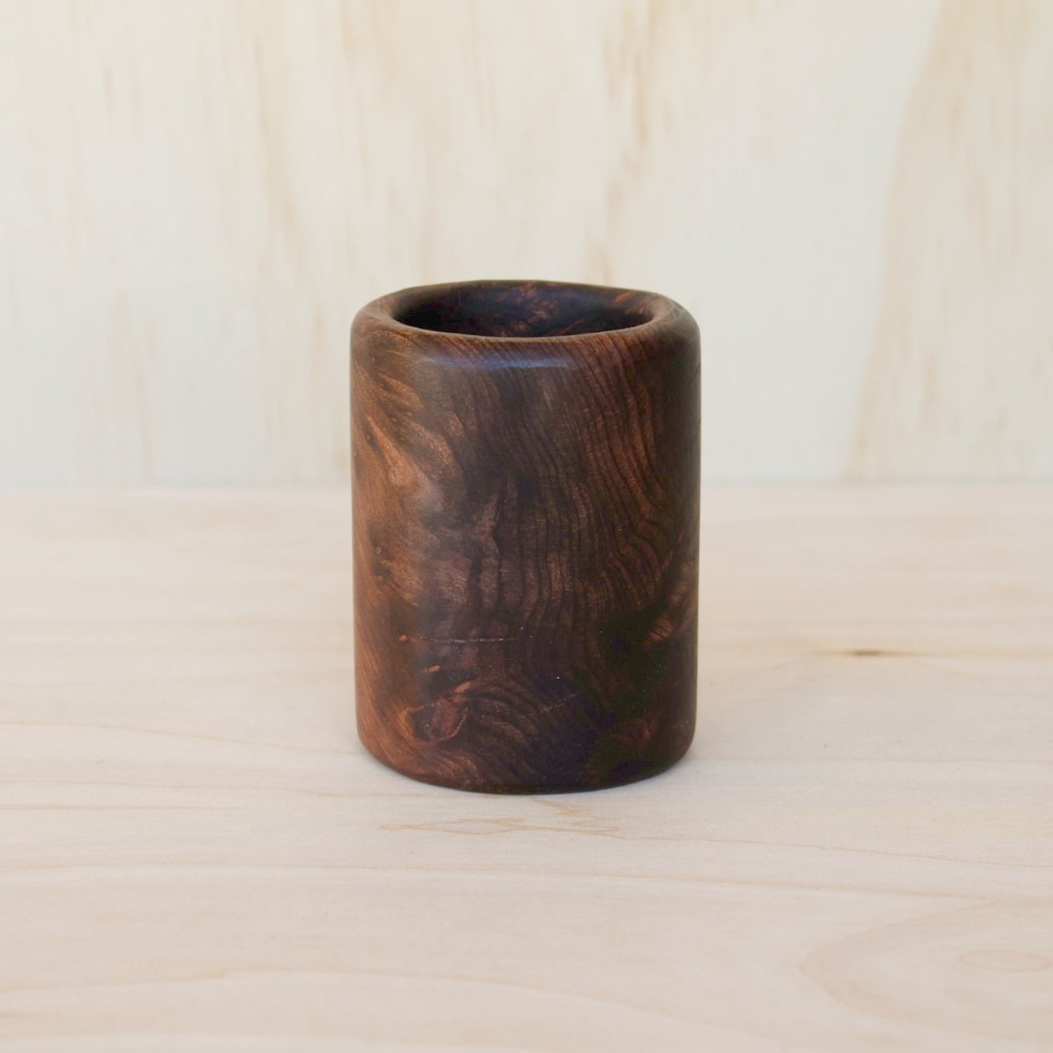 Turned from stabilized old growth Redwood, this shot glass carries the deep, reddish tones and straight grain that make the wood both timeless and resilient. At 2‑1/2 inches tall and 2 inches wide, it’s compact yet full of presence, shaped to feel steady in the hand. Finished with polymerized walnut oil, beeswax, and carnauba wax, the surface is smooth, protective, and built to season with use.
