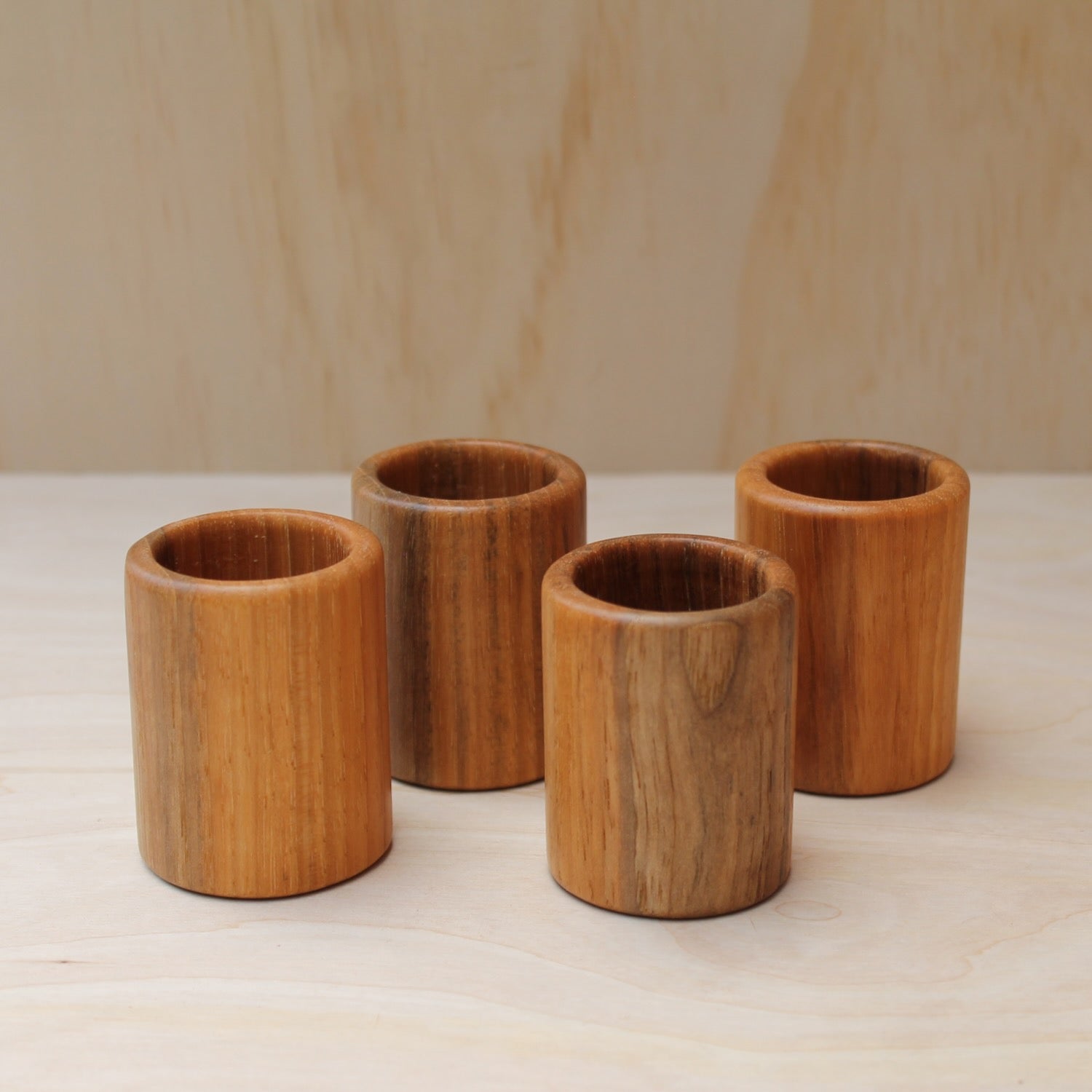 This shot glass is turned from pecan—a wood known for its density, resilience, and expressive grain. Each piece in this SKU shares the same dimensions and material, but the grain patterns vary from subtle striations to bold, high-contrast streaks. The color palette ranges from warm amber to deep brown, often with dramatic transitions that wrap around the form.